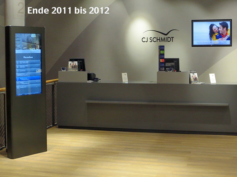 Die CJ Schmidt GmbH hat das größte Mode- und Sportkaufhaus Nordfrieslands (Husum) sehr aufwendig umbauen lassen. Namhafte Architekten waren damit beauftragt worden, ein neues, hochmodernes Ladenbaudesign zu entwerfen. Im Rahmen des Umbaus erhielt MUVI den Auftrag, ein innovatives und auf die individuellen Anforderungen der CJ Schmidt GmbH zugeschnittenes DIGITAL SIGNAGE Konzept zu erarbeiten. Es wurden elektronische Werbe- und Informationsdisplays sowie attraktive Design-Stelen (als elektronische Etagenplaner) in das neue Ladenkonzept integriert. Pünktlich zur Eröffnung der CJ Schmidt Häuser war das gesamte Projekt erfolgreich umgesetzt.
